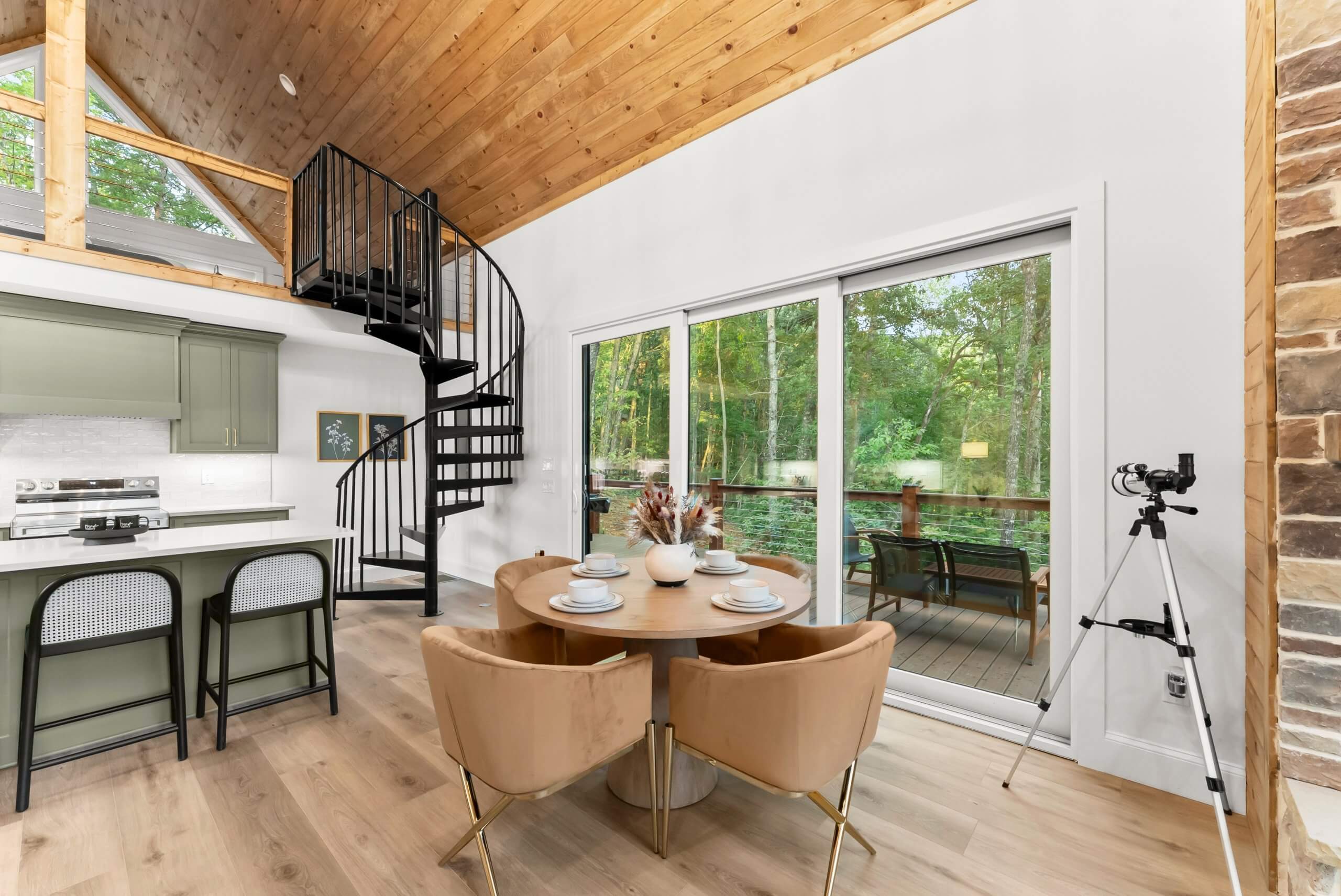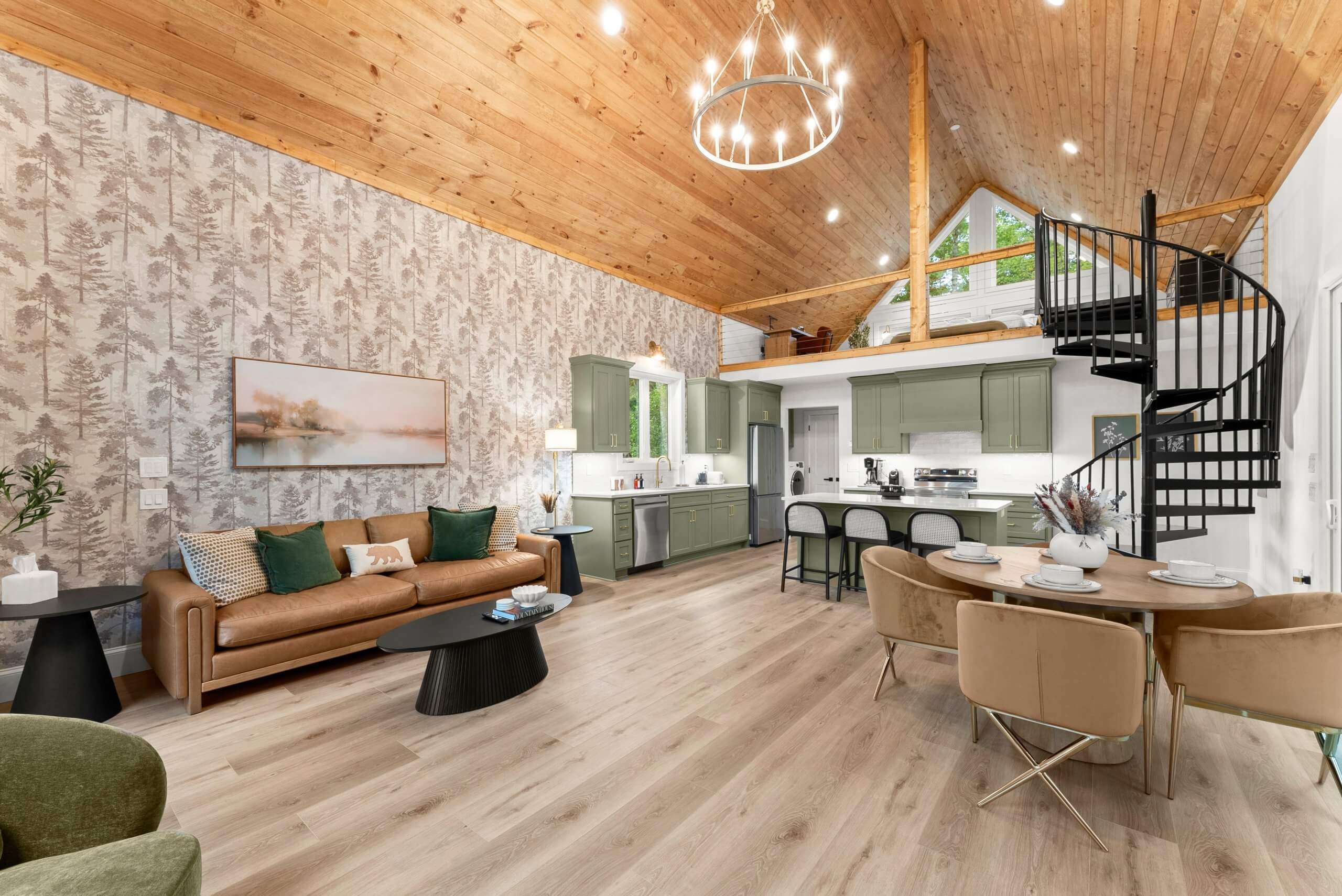 An open-concept layout, large windows, and comfortable furnishings create a bright, calming space designed for laid-back mountain living.